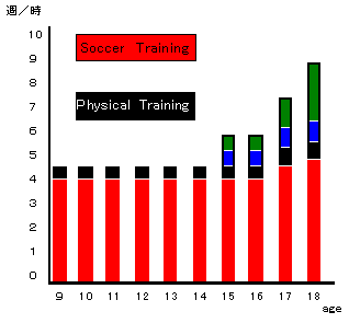 を行うようにしています。その方が体にとって効率がいいようです。下手に背丈が伸びないなどを防ぐためです。早熟型で精神的にも成長している場合は15歳ですぐにユースに昇格したりも